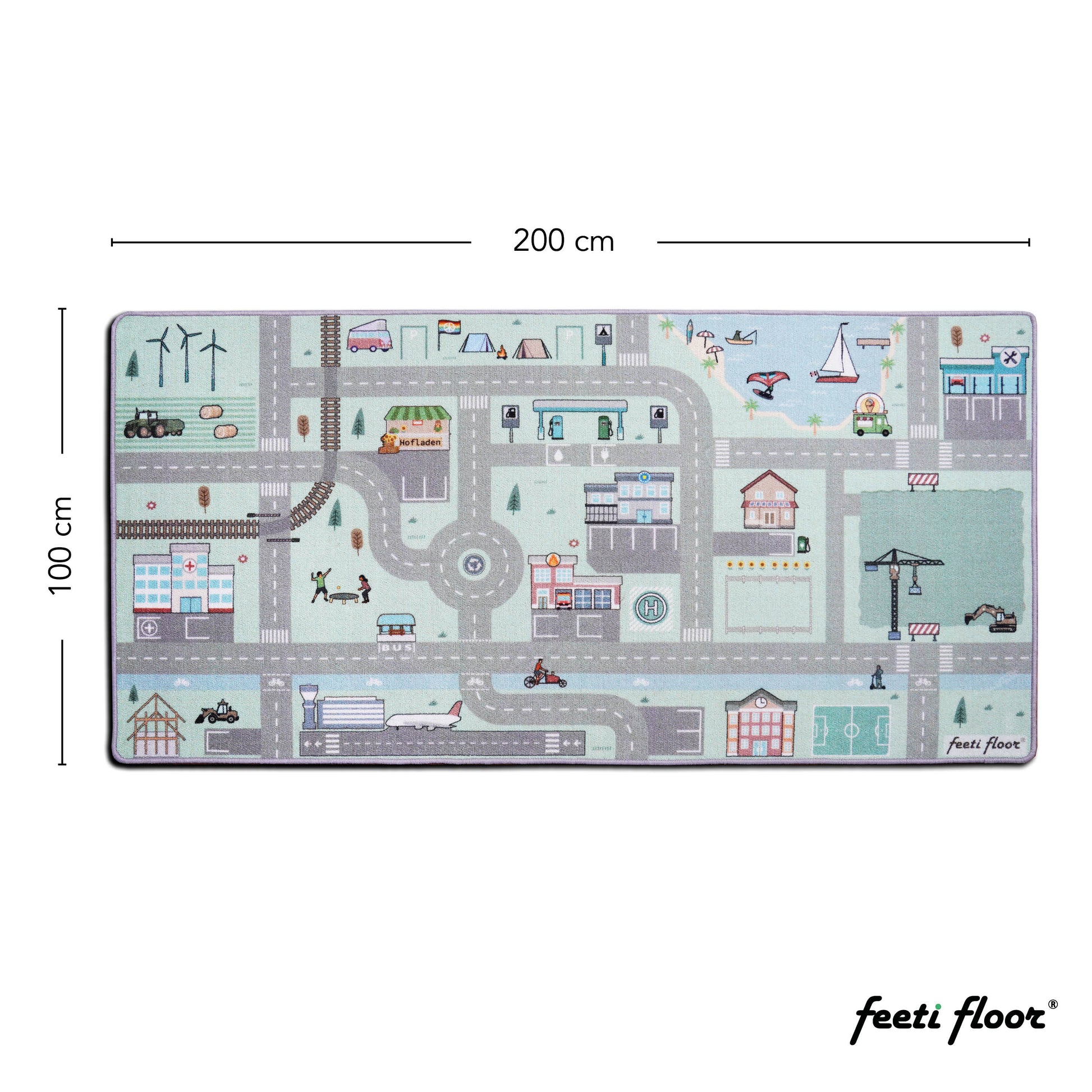 Whether it's wind turbines, a campsite, a farm shop or an e-charging station - whether on the water or on land: the Feeti Floor play mat is pastell, modern and versatile. It can be used with many common toys and offers enough parking space for your kids' fleet.